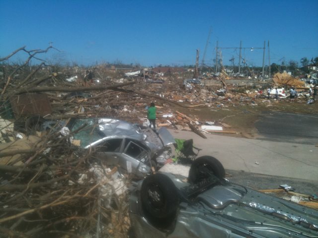 I was completely disoriented and could only see a collage of flipped over cars, rubble where houses and buildings once stood, debris, and a violent path where the tornado ripped through the heart of my town’s bustling center. The sight was simply terrifying and my next instinct made me reach for my phone to call all of my family and friends.